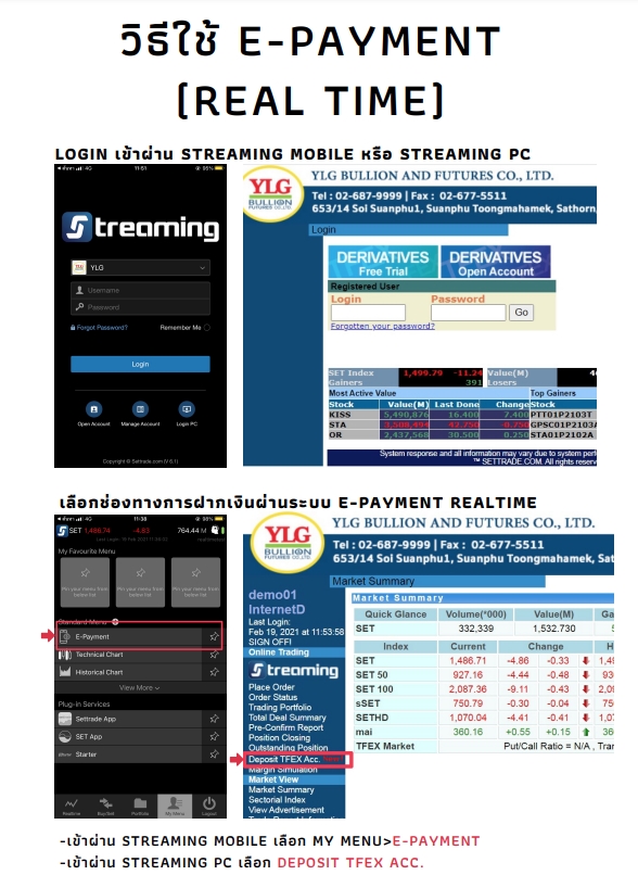 - ถ้าเข้าสู่ระบบผ่านเว็บไซต์ settrade ให้เลือกเมนู Deposit TFEX Acc. หรือ หากเข้าสู่ระบบผ่านโปรแกรม Streaming ให้เลือกเมนู E-payment ระบบ ATS จะทำการตัดเงินออกจากพอร์ตการลงทุนอัตโนมัติทันทีแบบ Real Time