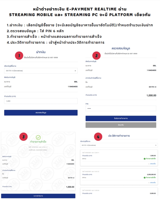 - ลูกค้าจะต้องสมัครเปิดบัญชี TFEX กับบริษัท YLG Future และได้รับการอนุมัติจากบริษัท YLG Future และทำการสมัครระบบการหักหลักทรัพย์อัตโนมัติ (Automatic Transfer System) หรือ ATS ผ่านตู้ ATM หรือเว็บไซต์ โดยสามารถดำเนินการผ่านธนาคารกรุงเทพ ธนาคารไทยพาณิชย์ และธนาคารกสิกร